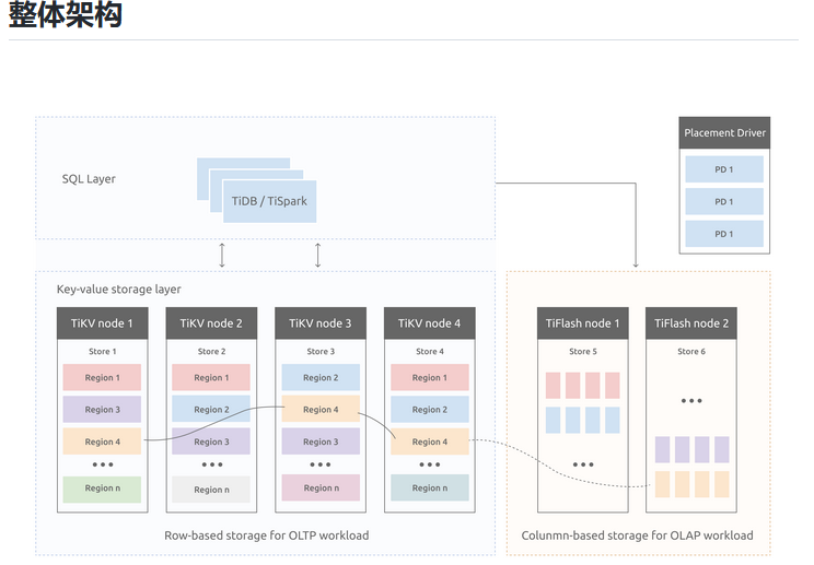 TiFlash 提供列式存储,且拥有借助 ClickHouse 高效实现的协处理器层。除此以外,它与 TiKV 非常类似,依赖同样的 Multi-Raft 体系,以 Region 为单位进行数据复制和分散(详情见《说存储》一文)。
