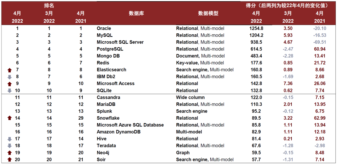 注:统计时间截至2022/4/22,评价维度主要包括在网络/技术论坛中被讨论/提及的次数、就业机会的数量、在职专家人数等,具体标准参考DB-engines官网公示