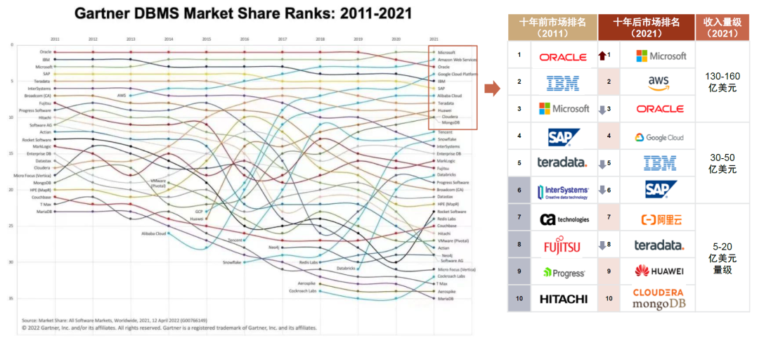 商业化视角:数据库市场处在多种技术路线并存、格局未定的状态,云成为搅动市场格局的重要力量。根据Gartner的数据,全球数据库市场规模从2017年至2021年以20%的CAGR高速增长至800亿美元。同时,我们观察到云原生、大数据项目、数据湖/仓库等路线带来了变革的力量,有的项目一经推出便很快进入市占率排行前列,比如2013年前后Hadoop路线下的Cloudera、2020年前后的Snowflake、Spark路线之下的Databricks。收入口径下,Gartner数据显示2021年云厂商Microsoft、AWS的市占率排名均已超过Oracle。全球数据库市场格局未定,云架构支撑的海量数据高性价比存储与分析成为影响市场格局的重要力量。