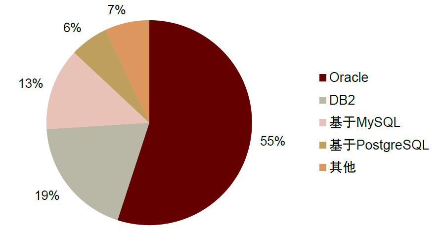 海外厂家在国内数据库市场占据主导份额,国产替代任重道远。从收入口径看,海外厂家仍在我国数据库市场占据主要市场份额,其中Oracle又占据主导地位。根据IDC的最新数据,2021年本地部署的关系型数据库产品市场中,仅Oracle一家的市场份额即接近27%;在金融行业中,Oracle的主导地位尤为明显,根据信通院的数据,2020年其在金融行业占据55%的数据库市场。