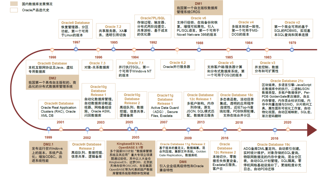 从产品迭代视角来看,Oracle等海外龙头进入国内市场时其产品已然成熟,而国内产品化刚起步。从1979年到1989年Oracle进入中国市场的时间节点,Oracle数据库已经迭代到第六版,不仅实现了行级锁、在线备份和恢复、增强可扩展性等核心性能与商业特性,而且完成了PL/SQL这一Oracle自有的SQL“方言”的拓展,产品历经20年的打磨已然成熟。而彼时国内数据库尚处于学术研究起步、积累阶段,海外厂商迅速在电信、金融、政务等重要行业拿下大单、近乎垄断。