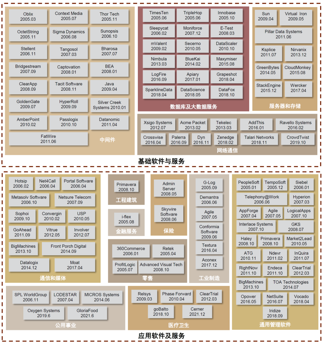 海外巨头通过收并购不断夯实基础能力,扩展产品生态。从产业链的角度来看,数据库除了锤炼自身的技术实力之外,对接上游需要接入服务器和存储、网络等IT基础资源,沿产业链下游支撑各行各业的应用软件系统。我们复盘Oracle、IBM、微软等数据库产品供应商发展史都会发现,各海外巨头均通过大量收并购补充基础技术实力、拓展生态应用。