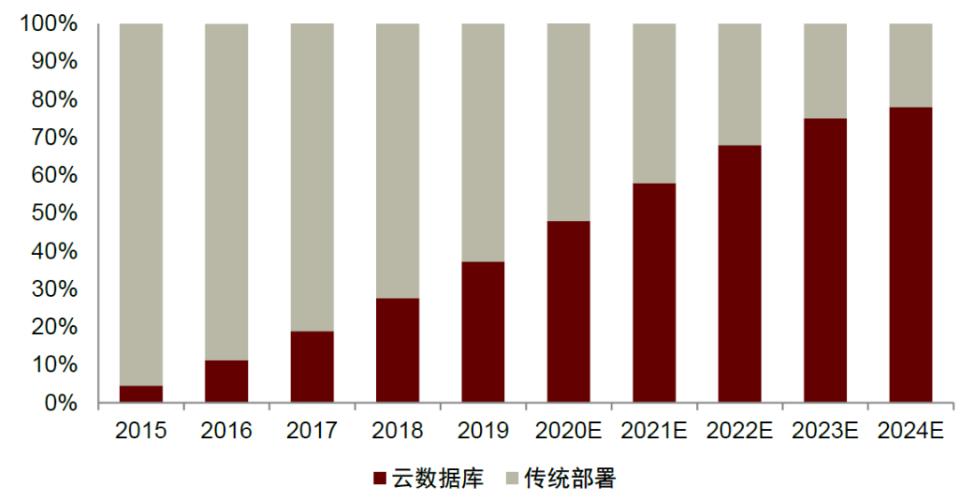 图表:预计云数据库数量在国内数据库产品所占的比例将逐渐提升,2015-2024e
