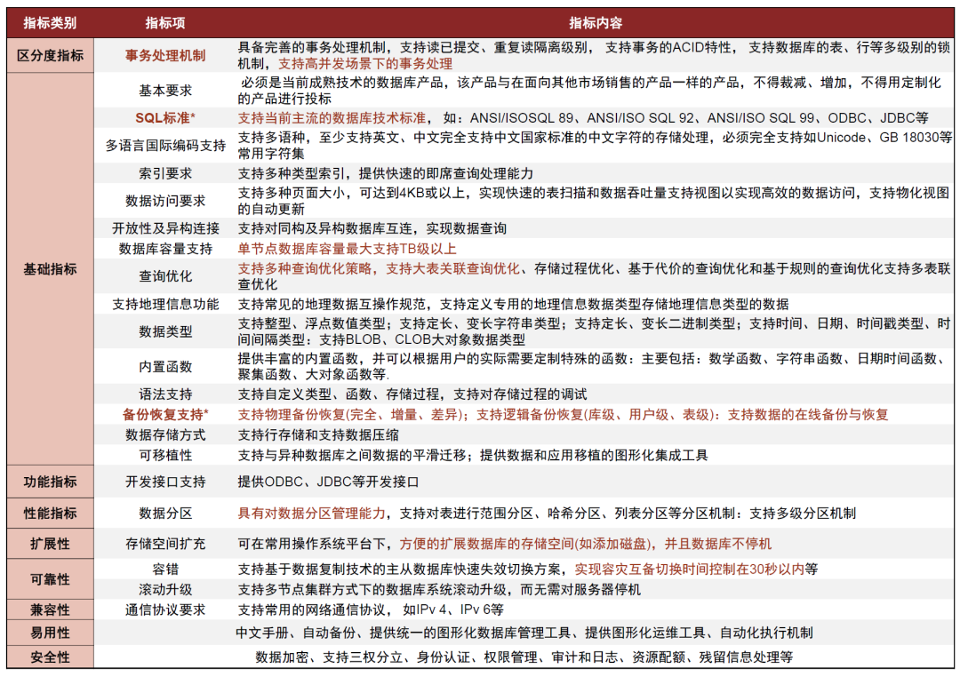 过硬的技术实力是在竞争中立稳脚跟的前提。数据库、大数据等是典型的智力密集型行业,具有研发投入大、研发周期长、技术壁垒高等特点,且随着5G、云计算和人工智能等新兴技术的深入发展,数据库、大数据相关技术升级迭代加快,需要供应商准确把握新技术发展动向和趋势,持续投入,并将新技术与现有的技术平台和核心产品有效结合。而落到具体考察的技术指标上,可以参考《中央国家机关2021年数据库软件协议供货采购项目征集公告》,其分别对事务型、分析型数据库系统评价体系做出明确要求。