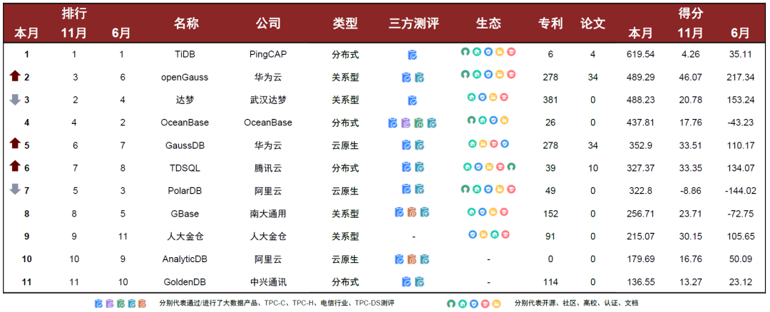 注:上表中产品从数据模型角度均为关系型,上表类型分类中的“关系型”特指非原生分布式、非云原生的传统关系型;openGauss特指开源项目,GaussDB指企业级产品,时间截至2021/12;评价维度主要包括搜索引擎、趋势指数、三方测评、生态(社区、高校合作、培训认证、开放文档等)、就业机会等,具体标准参考墨天轮官网