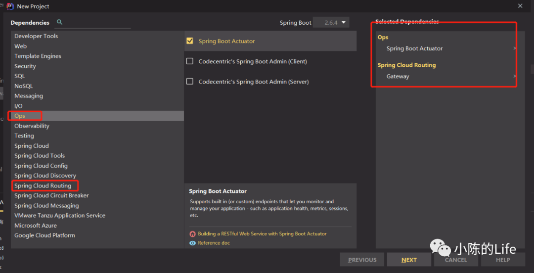 之后在选择依赖的时候选择Spring Cloud Routing -> Gateway和Ops->Spring Boot Actuator两个选项