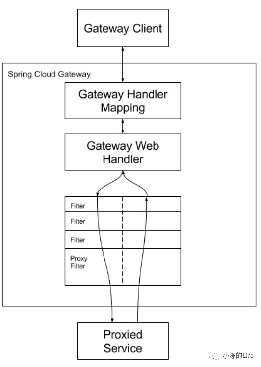 Gateway可以处理很多请求的转发,如上述架构图中,Gateway客户端发送请求给Spring Cloud Gateway,然后在Mapping中找到与之匹配的请求,并发送到相应的Gateway Web Handler,再经过一系列定义的Filter中,到达代理服务层面。并将其获取的内容反馈给Gateway Client请求。