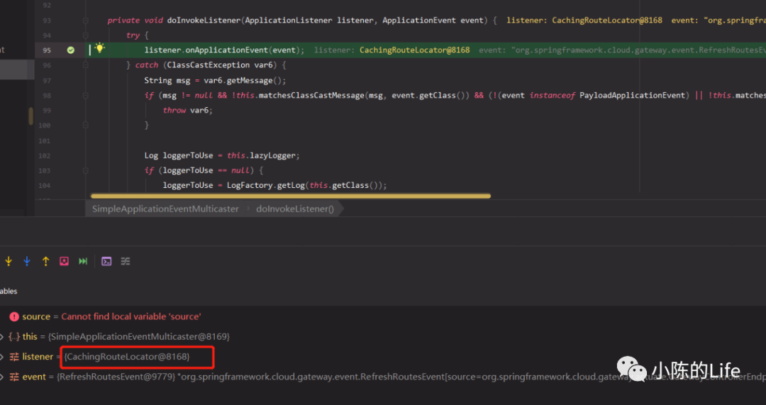 之后RefreshRouteEvent会按照正常流程进入multicastEvent中,这里我直接跟到图中显示的doInvokeListener方法中
