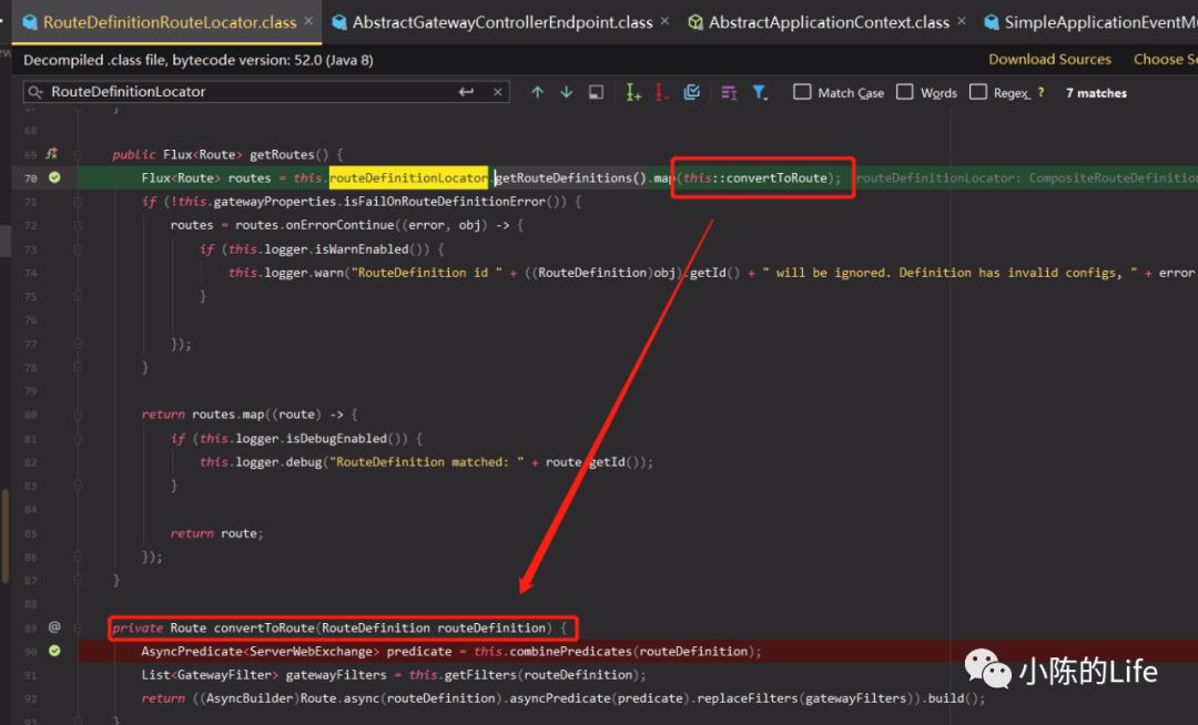 getRoutes方法首先通过this.routeDefinitionLocator.getRouteDefinitions()获取到了所有的RouteDefinition