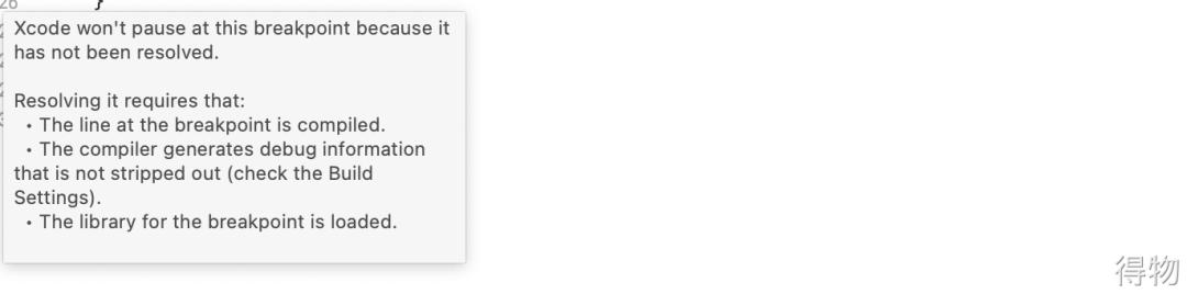 那么是什么原因,是不是我们哪里的操作步骤有问题?我们可以将鼠标放到断点的虚线上,此时Xcode会给出提示: