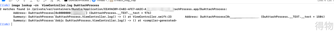 (lldb) image lookup -rn ViewController.log DuAttachProcess