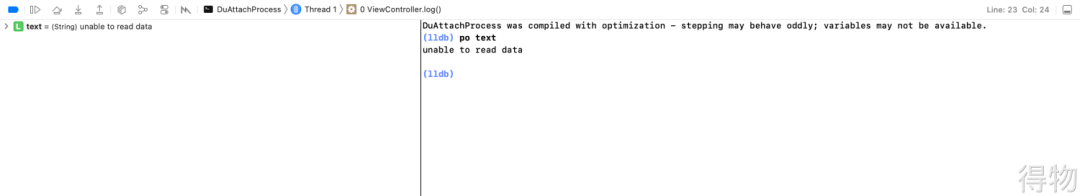 在控制台使用po命令验证变量读取,LLDB会抛出无法读取变量的警告,如图所示: