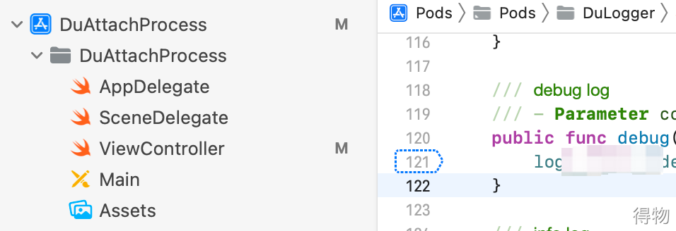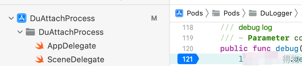 这里我准备了一个名为DuAttachProcess(使用cocoapods来管理组件)的测试工程来对我们的实时调试进行探索。