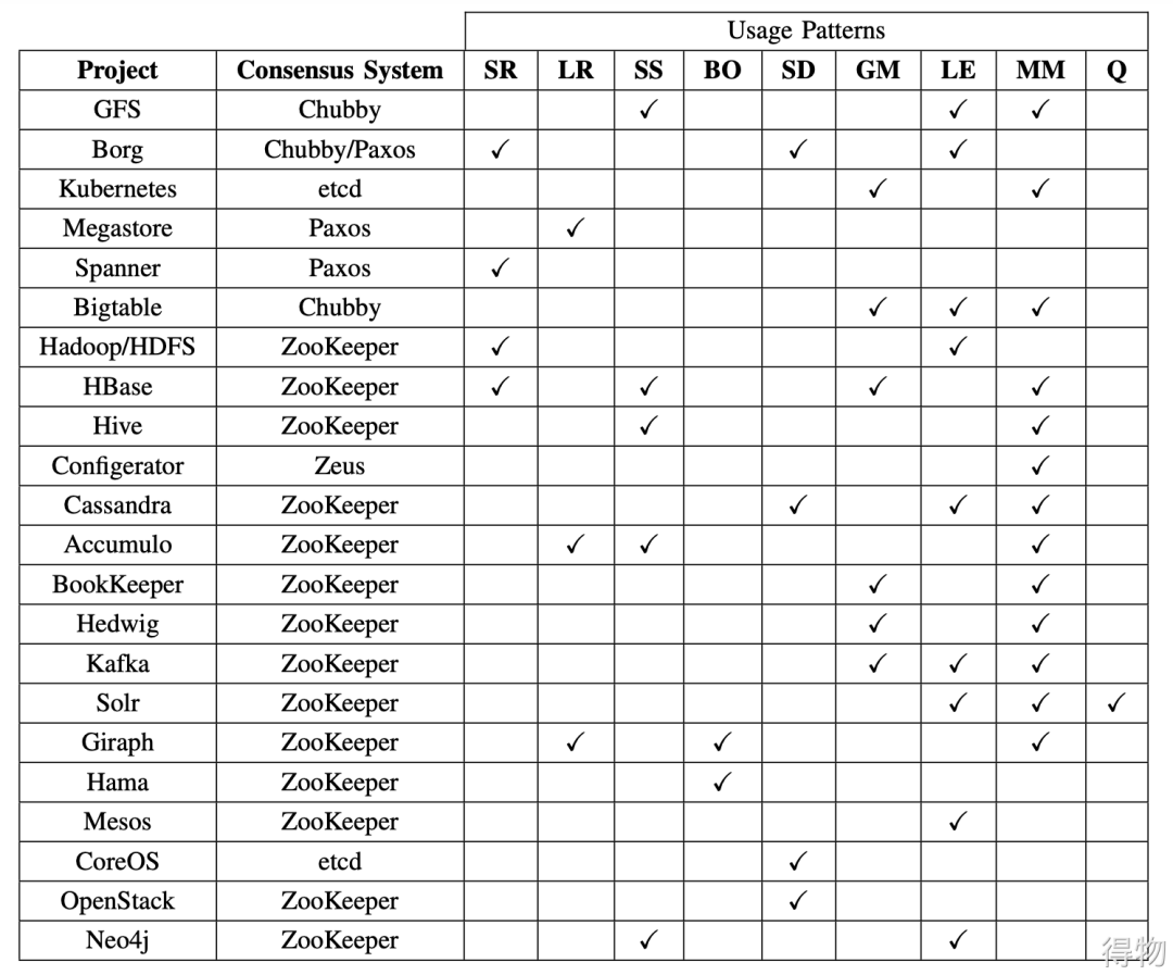 下图是有关Paxos Systems Demystified的论文中,常见的开源产品使用的一致性算法系统,可以看到除了google系的产品用paxos算法或他们自己的chubby服务外,开源的系统大部分都使用zookeeper来实现高可用的。