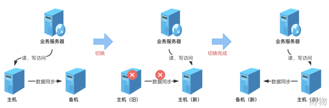 正常阶段的话,业务数据读写在主机,数据会复制到备机。当主机故障了,数据没办法复制到备机,原来的备机自动升级为主机,业务请求到新的主机。原来的主机恢复后,成为新的备机,将数据从新的主机同步到备机上