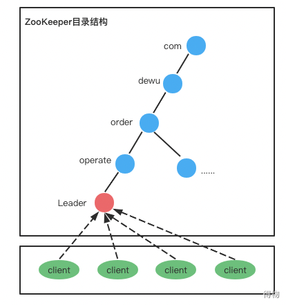 parent znode:图中的 operate,代表一个集群,选举结果写入到operate节点,比如写入的内容可以是:leader=server6。