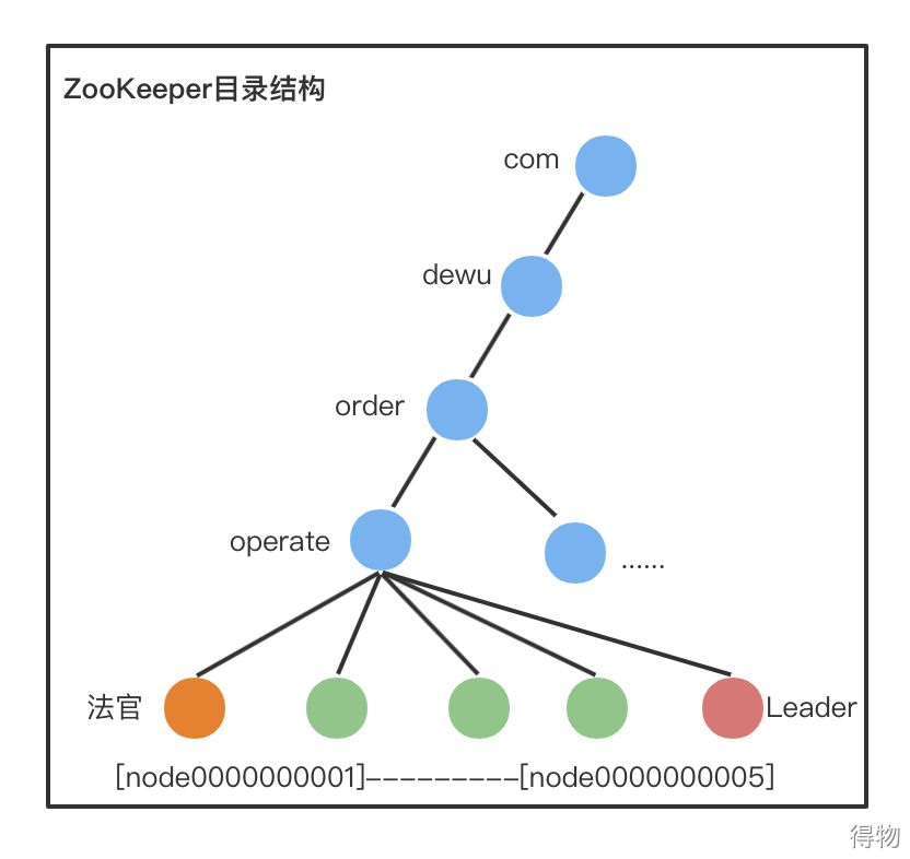 法官 znode:图中的橙色 znode,最小的 znode,持有这个 znode 的节点负责选举算法/规则。