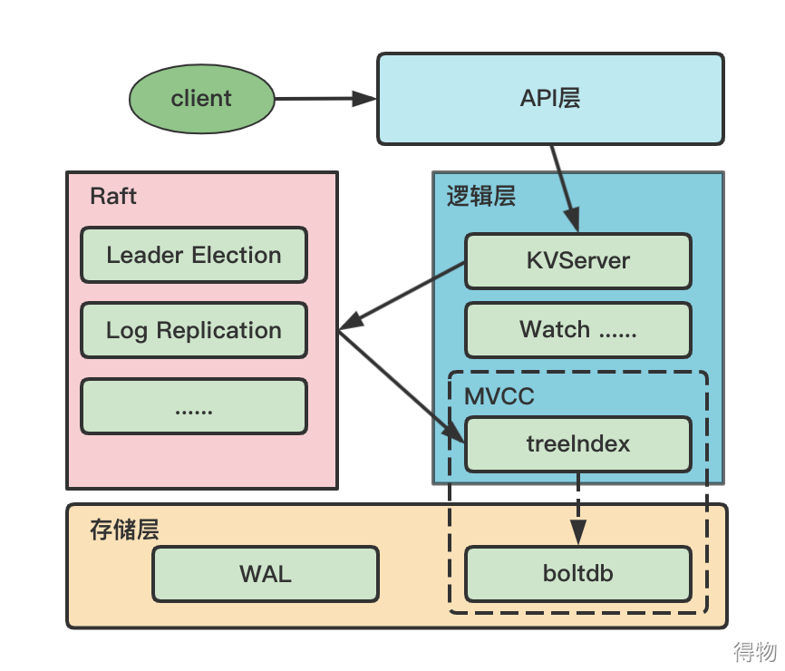 通常,一个用户的请求发送过来,会经由 HTTP Server 转发给 逻辑层进行具体的事务处理,如果涉及到节点的修改,则交给 Raft 模块进行状态的变更、日志的记录,然后再同步给别的 etcd 节点以确认数据提交,最后进行数据的提交,再次同步。