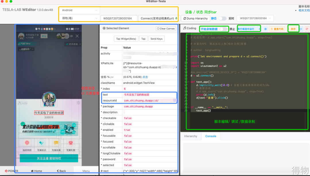 支持手动编写或者通过点击页面生成对应代码,支持运行/暂停来调试脚本。