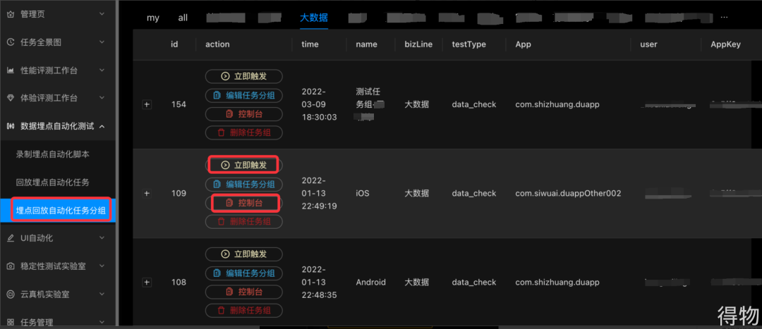 新建运行任务并选中前面新建的脚本和Mock记录,执行任务之后得到一组埋点数据(即测试记录)。