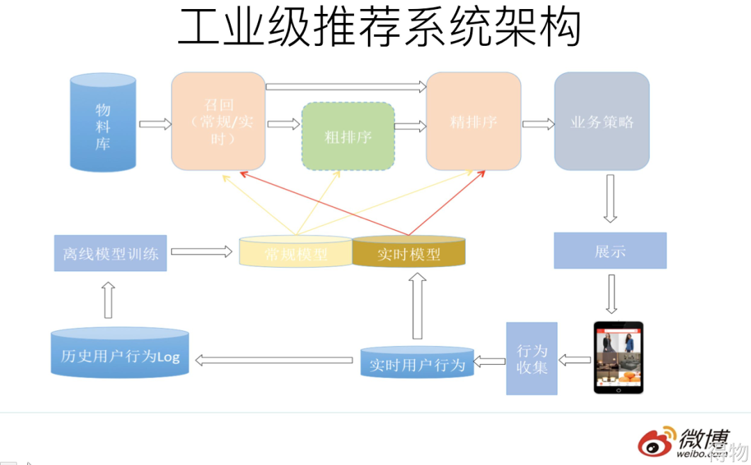 对于在线部分来说,一般要经历几个阶段。首先通过召回环节,将给用户推荐的物品降到千以下规模;如果召回阶段返回的物品还是太多,可以加入粗排阶段,这个阶段是可选的,粗排可以通过一些简单排序模型进一步减少往后续环节传递的物品;再往后是精排阶段,这里可以使用复杂的模型来对少量物品精准排序。对某个用户来说,即使精排推荐结果出来了,一般并不会直接展示给用户,可能还要上一些业务策略,比如去已读,推荐多样化,加入广告等各种业务策略。之后形成最终推荐结果,将结果展示给用户。