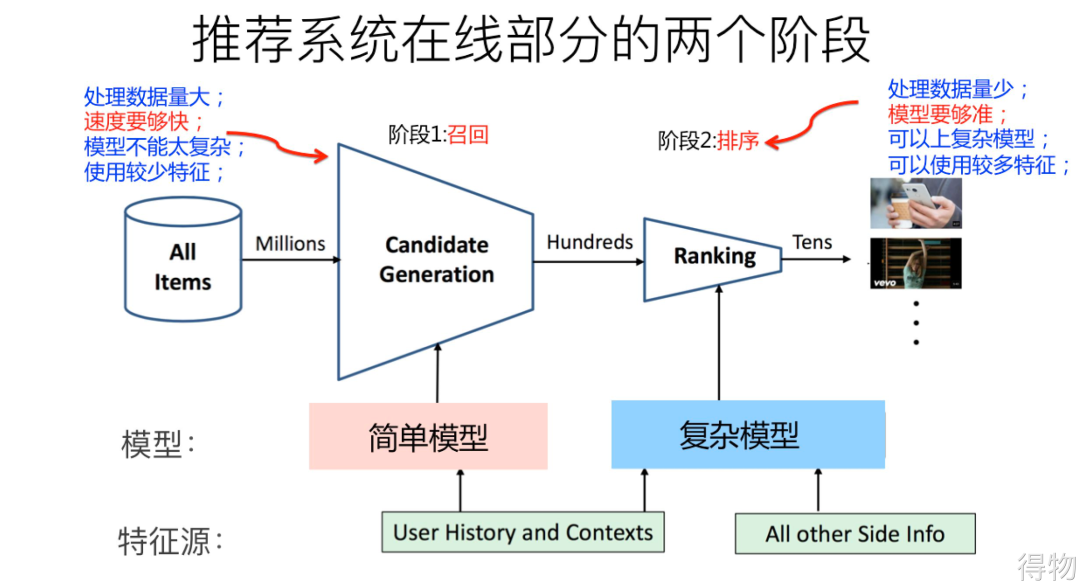 在推荐系统里召回是推荐系统的第一阶段,主要根据用户和商品部分特征,从海量的物品库里,快速找回一小部分用户潜在感兴趣的物品,然后交给排序环节。这部分需要处理的数据量非常大,速度要求快,所有使用的策略、模型和特征都不能太复杂。