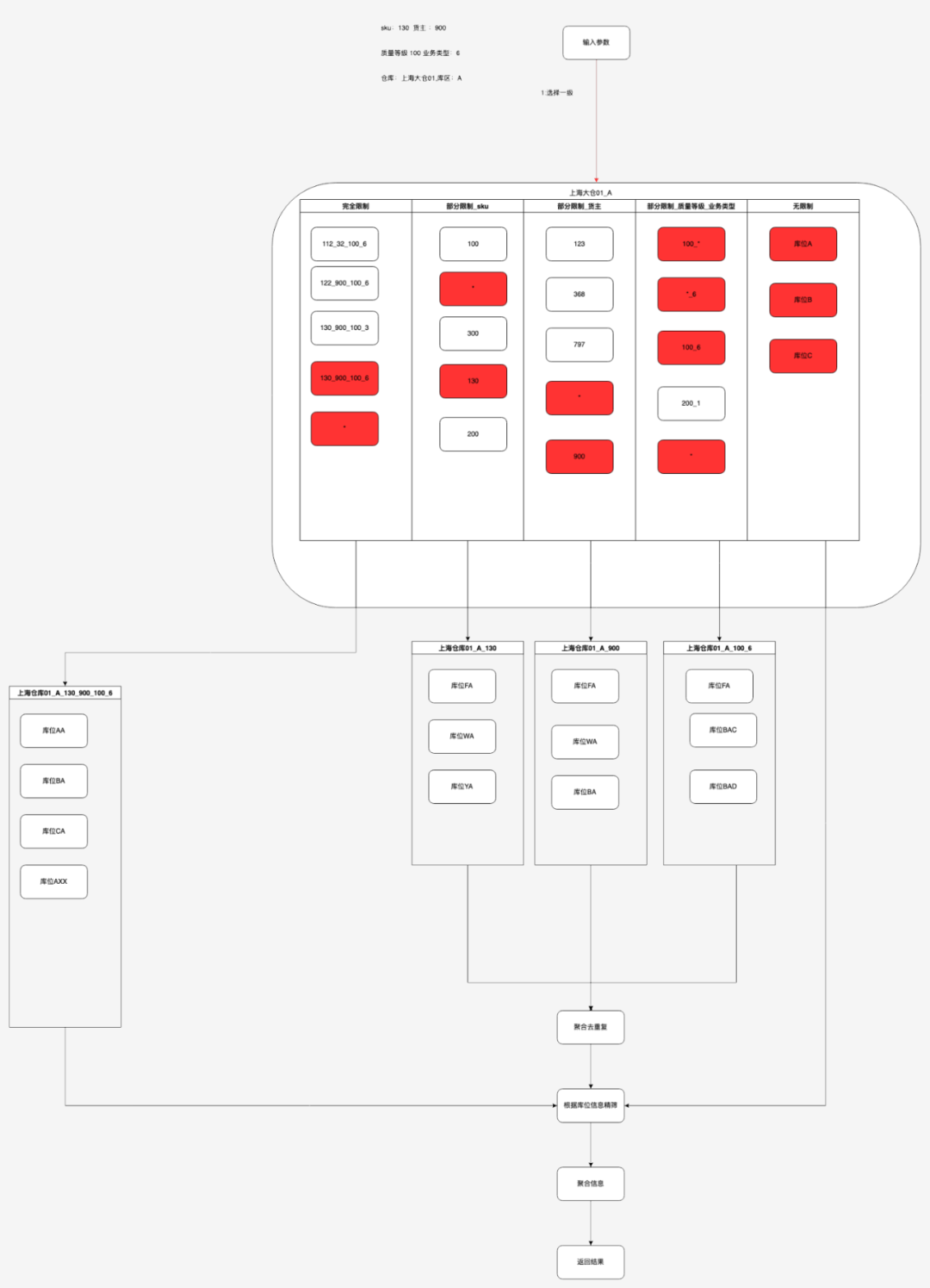 {"仓库_库区_完全限制":["A_B_6_100", skuId:A 货主:B .bizType:6,质量等级100"B_B_6_100",// skuId:B 货主:B .bizType:6,质量等级100"*",//空库位],"仓库_库区_sku限制":["SKU1", sku:1的"SKU2","SKU3","*", 空库位],"仓库_库区_货主限制":["小A",//货主小A"小B","小C","*", 空库位],"仓库_库区_质量等级_业务类型":["100_6",//质量等级:100 业务类型:6"200_7","100_1","*_3",//质量等级无限制 业务类型限制3"100_*"//质量等级100 业务类型无限制"*", 空库位],"仓库_库区_无限制":["库位A", 无限制直接到达库位成面 无限制没有三级索引"库位B","库位C"],}