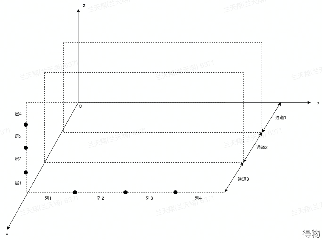 问: 上架员A面拖着一车鞋。在A,B库区(A,B库区相连 并且都是放鞋子)中间需要进行选择。那么小A如何选择最佳?首先我们需要考虑几个问题。1:货架是有高层货架。高层货架是需要人借助工具爬上去的。比如楼梯2:如何知道上架员的起点。如果定位不到上架员的坐标。则无法有效推荐最短路径3:如何知道俩个库位相邻关系 如何知道俩个库位的高低层关系4: 需要考虑层级问题。因为高层货位上架员需要楼梯爬上去。我们可以对以下场景进行建模,考虑以下理想情况:假设人的起始坐标是(0,0,0),需要将货上到通道P(通道间隔为a),列数Q(列间隔为b),层数R(层高为c)的货架上。人与货架的三维坐标关系如下图所示: