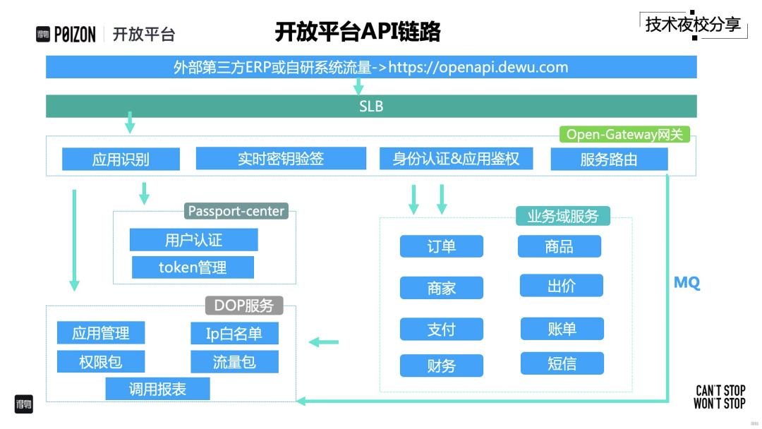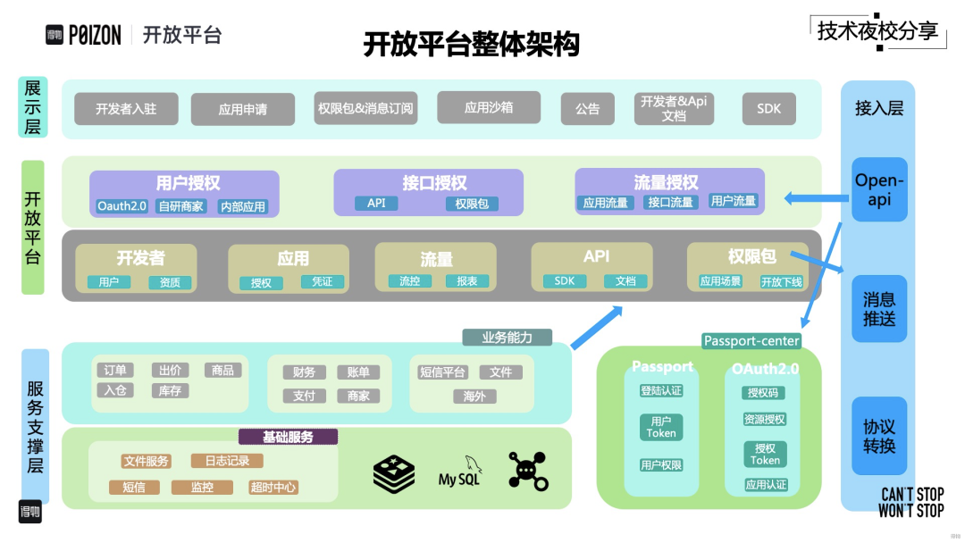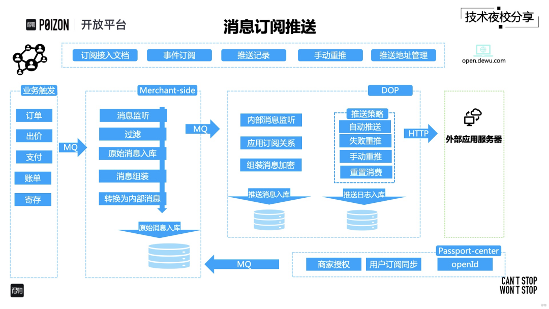 ▪ 开放平台接入层包含:openapi.dewu.com的api调用和消息订阅的消息推送功能,提供协议转换。