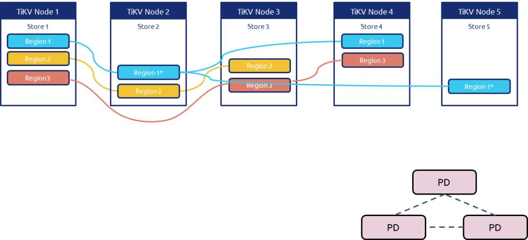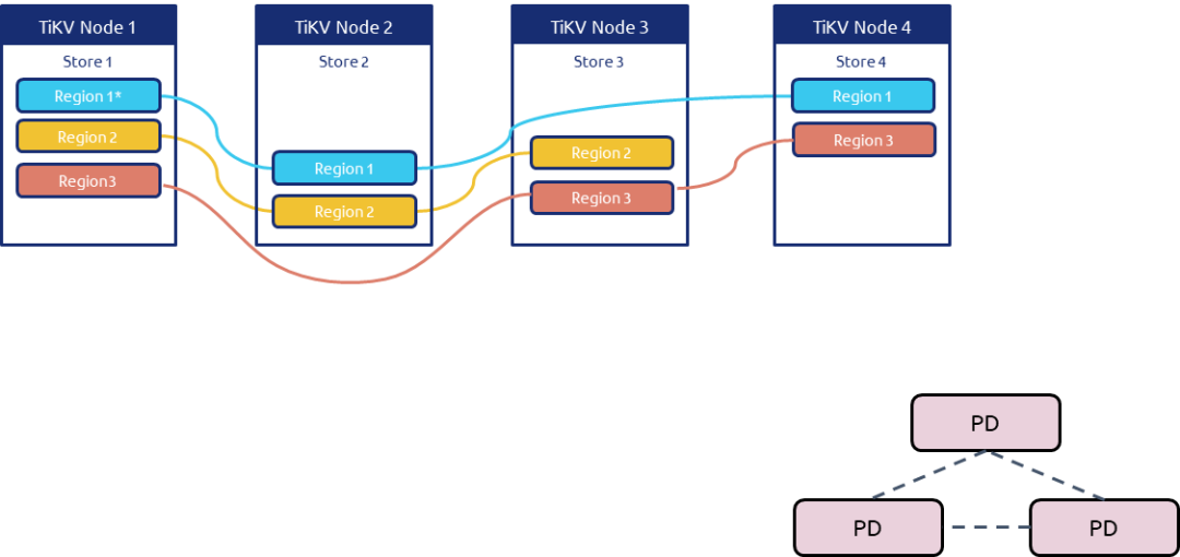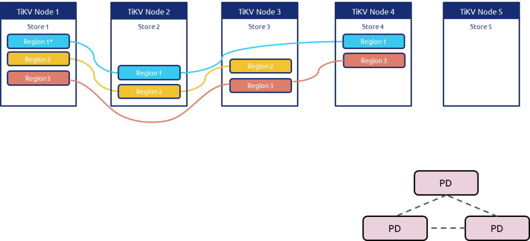 1、比如当前的架构是4台 TiKV 节点,假设其中 Node1 的负载较高,我们要把 Region1 迁移出到新节点。