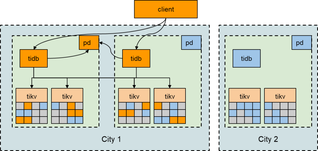 TiDB 分布式数据库通过 Raft 算法原生支持两地三中心架构的建设,并保证数据库集群数据的一致性和高可用性。而且因同城数据中心网络延迟相对较小,可以把业务流量同时派发到同城两个数据中心,并通过控制 Region Leader 和 PD Leader 分布实现同城数据中心共同负载业务流量的设计。