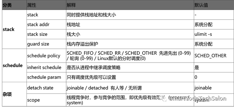 其他属性操作系统都可以搞定,最需要关注的是【detach state】属性。detach state的意思就是,创建的线程是detach还是Join。detach意味着线程结束之后,相关资源就会被立刻回收;Join是在线程结束之后资源不会立刻释放,而是等待别的线程来join,当把自己的返回值交给来join的线程之后,自己就会被释放,如果一直没有线程来join,那这个线程就会一直存在,直到进程结束。