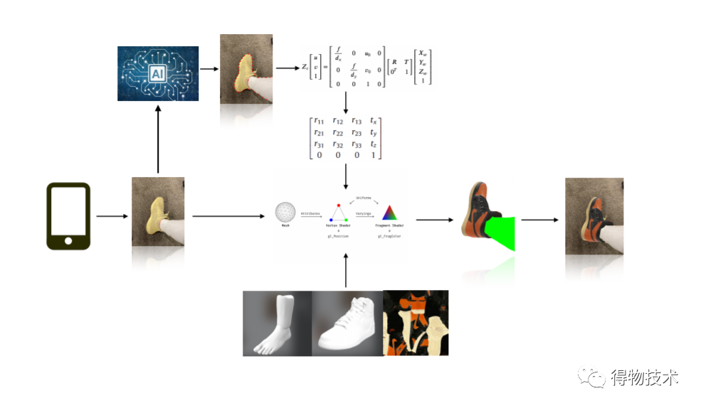 相机在进行图像采集时,会以30帧/S的速度采集图片数据,对每一帧的图片数据进行处理。随后对图片数据进行算法/AI识别,识别图片的关键点,根据这些关键点进入姿态求解的过程,进而输出姿态矩阵。根据姿态矩阵,结合3D建模的模型数据,导入到渲染引擎中,就可以渲染出对应的3D图片信息,最后与相机拍摄的图片做叠加,就可以完成对应的AR效果。以上就是球鞋试穿实现的流程,可以总结为3D建模,姿态求解,模型渲染三个部分。