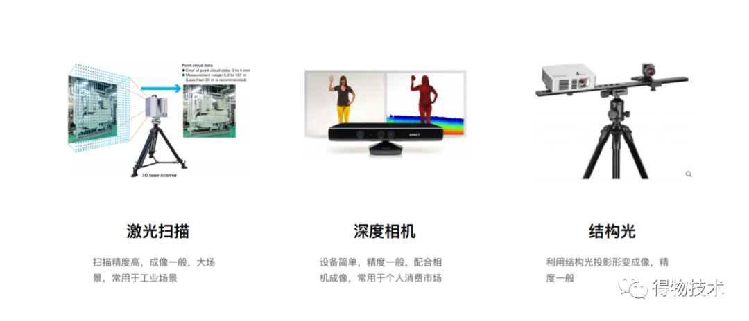 手工数字建模比较常用的场景在影视界,如虚拟角色/城市,常用工具有MAYA、3DMAX等,但数字建模很难复刻现实生活中的物体模型。3D扫描建模比较常见的工具有激光扫描、深度相机、结构光。激光扫描常用于工业场景,深度相机常用于个人消费市场(如手机的人脸识别),结构光是用结构光投影形变成像,但这种方式误差较大。
