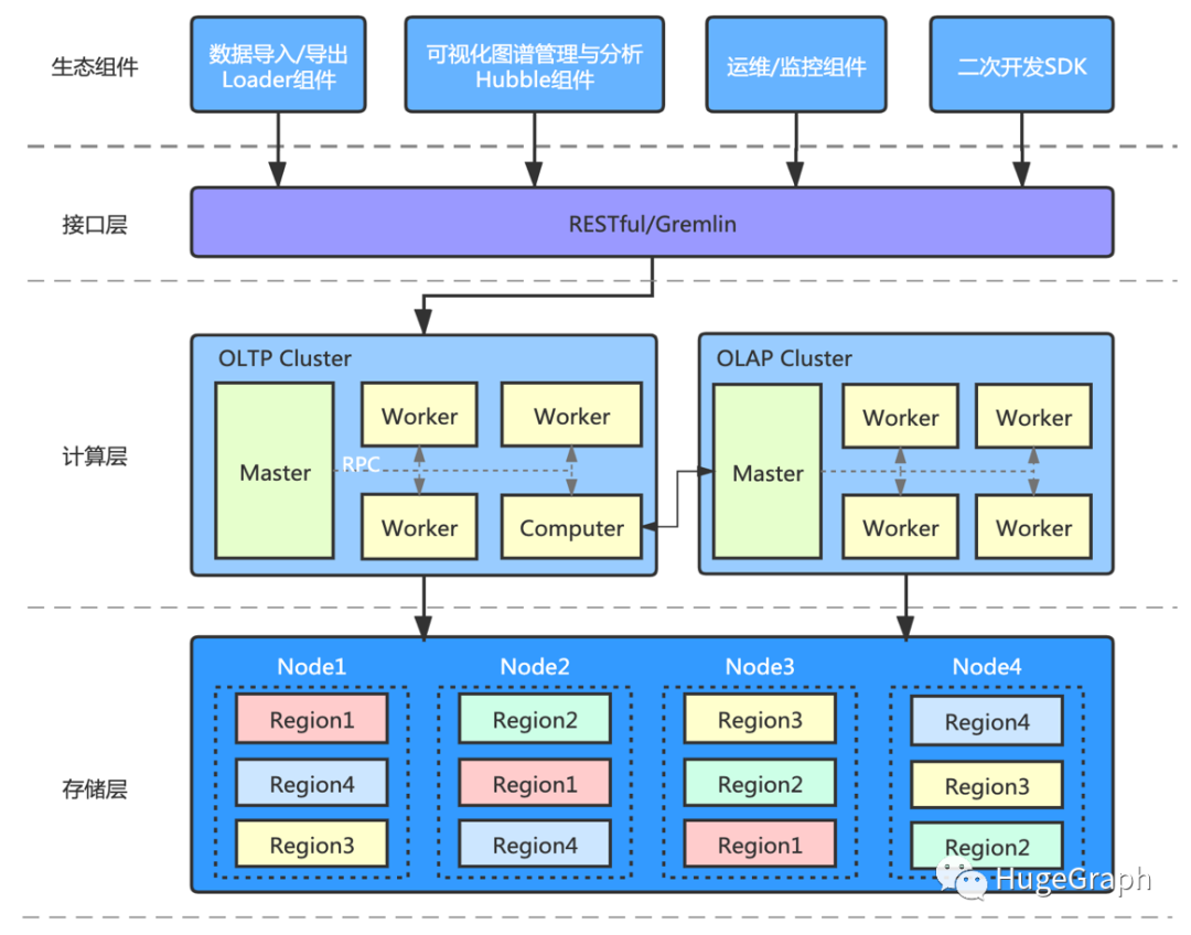 图数据库与图计算系统紧密打通,普通用户开箱即用,单系统内具备HTAP能力,图计算系统支持千亿规模图的BSP并行计算;