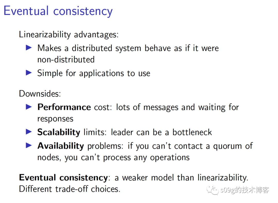 线性一致性是分布式系统中非常方便的一致性模型,因为它保证系统的行为像只有一个数据副本一样,即使系统实际上是多副本的。这使得应用程序可以忽略与分布式系统合作的一些复杂问题。然而,这种强力的保证也是有代价的,因此,线性一致性并不适合所有的应用。