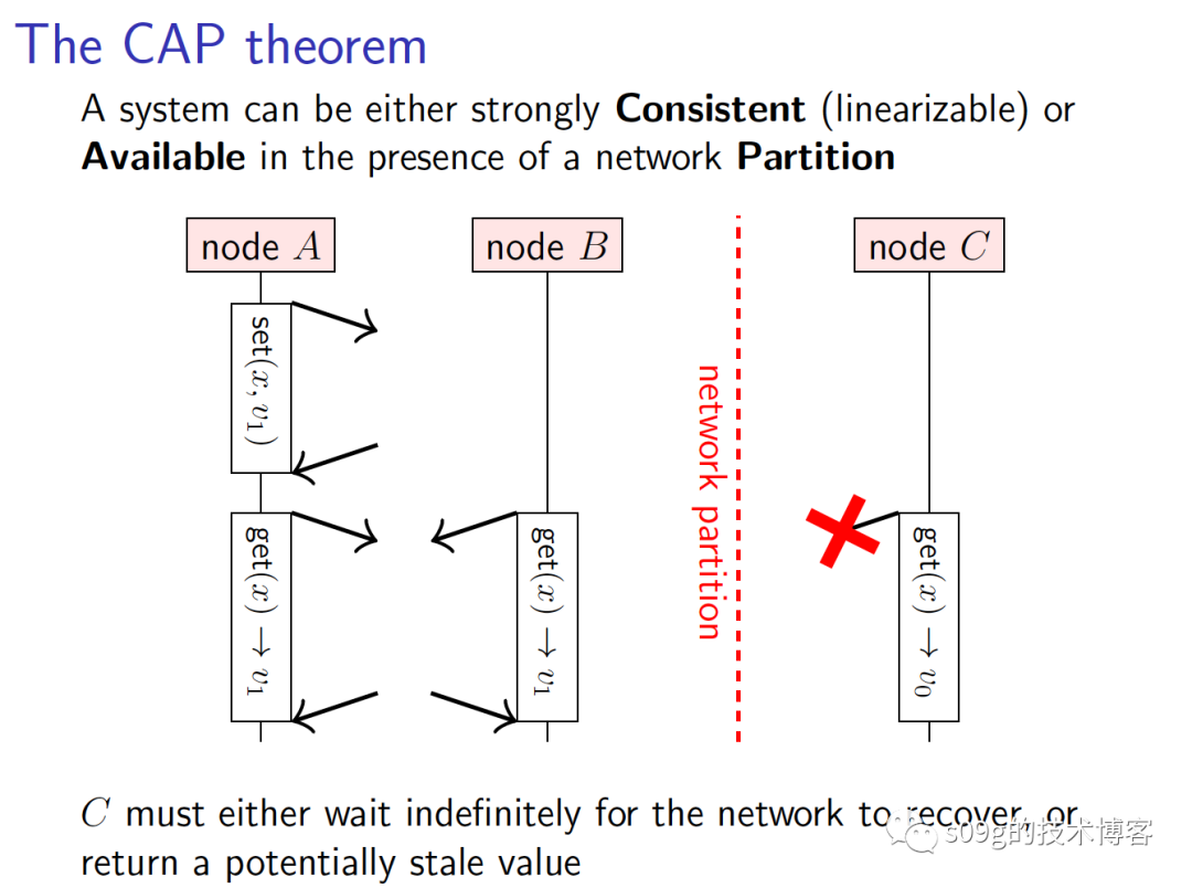 上图说明了,节点C无法与节点A和节点B通信。 在分区的A和B那边,线性一致的操作可以正常进行,因为A和B构成了一个quorum。然而,如果C想读取x的值,它必须等待(可能是无限期的),直到网络分区被修复,或者它必须返回其本地的x值,这并不反映分区另一侧的A之前写的值。