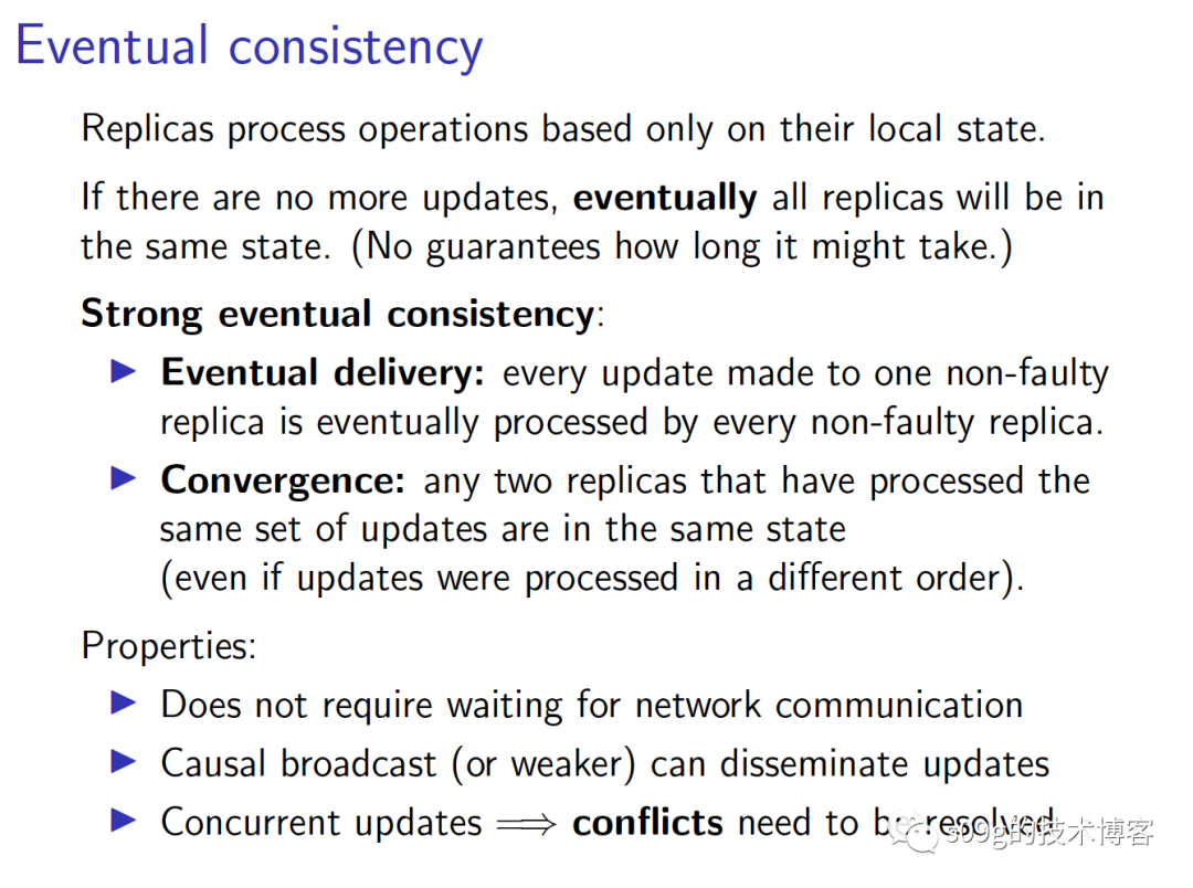 允许每个副本只根据其本地状态来处理读和写,而不等待与其他副本的通信,这种方法被称为optimistic replication 乐观复制。人们为乐观复制系统提出了各种一致性模型,其中最著名的是eventual consistency 最终一致性。