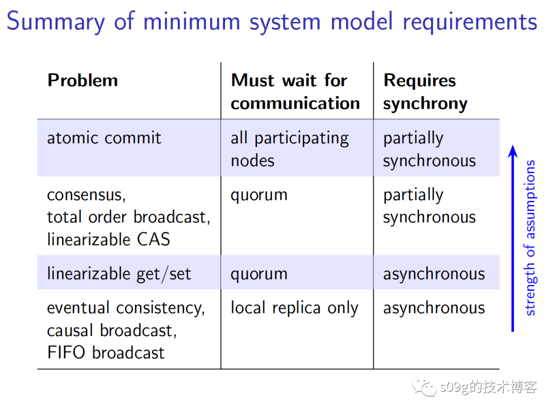 原子提交具有最强力的假设,因为它必须等待与参与交易的所有节点(可能是系统中的所有节点)进行通信。共识、全序广播和线性一致算法的假设稍弱,因为它们只需要等待与quorum通信,所以它们可以承受一些不可用的节点。FLP不可能原理向我们表明,共识和全序广播需要部分同步。可以证明,一个线性一致的CAS操作等同于共识[Herlihy, 1991],因此也需要部分同步。另一方面,线性一致的get/set