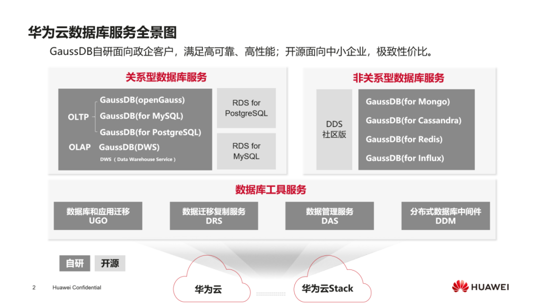 时间来到2020年7月20日,在华为云TechWave技术峰会上,华为云数据库业务总裁苏光牛正式发布两大战略性数据库新品,包括关系型数据库GaussDB(for MySQL)和非关系型数据库GaussDB NoSQL系列,标志着华为数据库战略性升级,依托华为公有云和华为云Stack全面布局云数据库。。2020年9月17日,华为又在关系型领域正式推出了GaussDB(for PostgreSQL)和GaussDB(openGauss)等新品,以统一的架构面向政企客户,提供高性能、高可靠、高安全的云服务。至此,华为云GaussDB系列家族布局完毕,发布的产品包括关系型数据库GaussDB(for MySQL)、GaussDB(for PostgreSQL)、GaussDB(openGauss),以及非关系型数据库GaussDB NoSQL系列,支持文档类型(MongoDB)、宽表类型(Cassandra)、时序(InfluxDB),K-V(Redis)等多协议接口。当天,华为云还正式推出数据库和应用迁移工具 UGO,这是一款专注于异构数据库对象迁移和应用迁移的专业化工具,通过预迁移评估、结构迁移两大核心功能,实现主流商用数据库到华为云数据库的自动化搬迁,让客户轻松上云、一键切换数据库。数据库源库画像:提供源库TPS、IOPS、QPS、DB配置、内存使用率、DB容量、活跃会话、表复杂度、CPU使用率、SQL复杂度等方面的数据,为客户迁移提供精准画像。