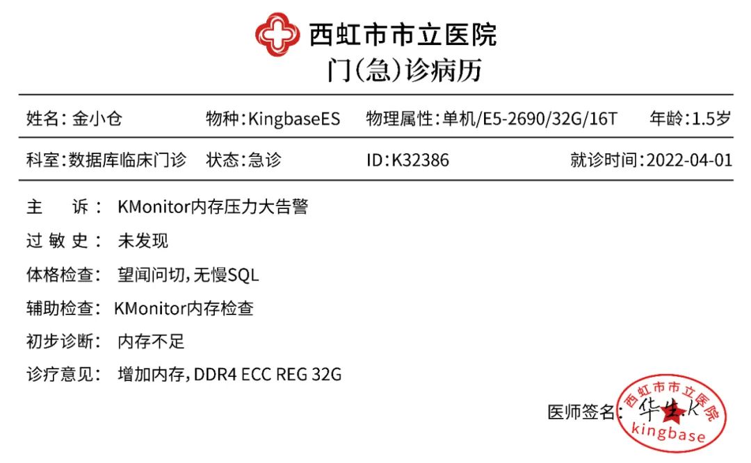 “一般是查询量突然增多导致的内存压力突增,先增加物理内存试试吧。” 华生·K医生给金小仓插入了一根新的内存条。看着内存监测图中慢慢降下来的压力值,他轻轻地拍了拍金小仓安慰道:“别怕,只是查询量突增而已,加根内存条不就好了嘛。”随后,金小仓接过病历单长舒一口气,心想还好身体内置了KMonitor芯片,可以与医院实时联动,及时发现处理问题。硬核复诊—高效处理故障