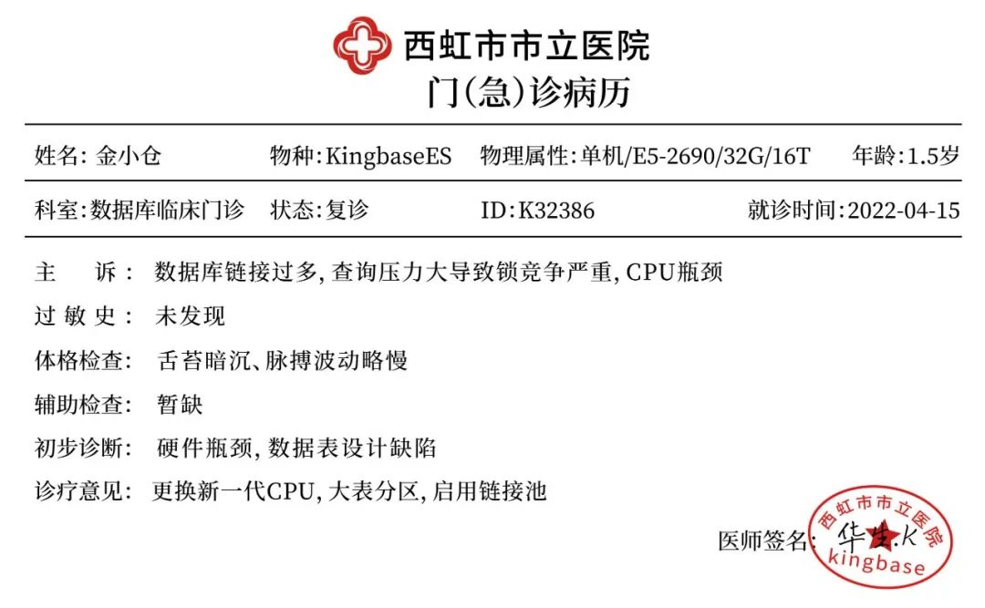 时隔两周,金小仓又出现在市立医院的数据库门诊大厅,这次的他似乎神情略显呆滞,慢吞吞地进入诊室。今天是华生·K医生坐诊,金小仓说道:“大夫,一周前客户新增了应用系统的业务模块,就开始觉得自己呆呆的,不知道哪里出了问题。”华生·K医生检查起金小仓的基本状态:舌苔暗沉、脉搏波动略慢。“从这些症状来看,基本确定是因为最近一周突增大量数据库链接,导致查询压力过大,从而产生的锁竞争情况格外突出,同时CPU应该有瓶颈。” 华生·K医生依靠多年的临床经验心中慢慢分析,同时说道,“再做个KMonitor检查,它出具的检查报告更加详细,可以确定问题根源对症下药,顺便再检查下最近的内存问题,看看有没有异常波动。” 华生·K医生将目前发现的问题简单列到了病历上。“躺下不要动,静下心来,深呼吸……”,一边说着,华生·K医生一边操作着新引进的KMonitor设备为金小仓做全身扫描检查。片刻后,一张张检查报告自动打印了出来。华生·K医生盯着KMonitor出具的内存检查报告,看来新增的业务模块对内存的压力还是很大的,内存使用率都到95%了。紧接着,华生·K医生查看了KMonitor输出的KingbaseES性能报告,最近两周以来,数据库链接持续增长,缓存命中率逐步降低,说明前期的诊断方向是正确的,提高内存容量解决了部分问题。随后华生·K医生又翻看了近一个月来整体的性能压力走势图,心中沉思道“压力持续增长,可以考虑扩容节点,搞成读写分离集群形势,可以让备节点分担一些查询压力。”最后华生·K医生通过KMonitor检查了金小仓的SQL查询情况,查询报告中显示出了“响应时间抖动最严重语句”“平均查询时间最慢语句”等信息,华生·K医生挨个语句进行分析: