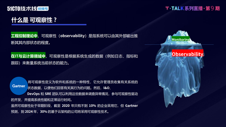 观测性最早诞生于控制理论中,指系统可以由外部输出,推断其内部状态的程度。在IT领域中,Gartner将可观测性定义为软件与系统的一种特性。具体指根据系统生成的遥测的数据来判定当前系统的状态以及系统情况,这种能力便是可观测能力或称可观察能力。