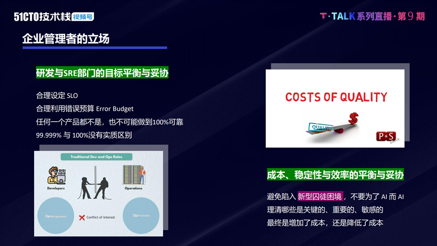 在AIOps的落地层面,企业需要考虑的问题也比较多。从企业管理者的角度来说,除了成本、团队等基础问题外,还需要考虑不同部门之间的平衡,以及成本、稳定性和效率之间的平衡问题。AIOps的目标,是既要解决问题,还要合理地解决问题。在保证成本的同时,最大化地提高企业业务的稳定性与效率。