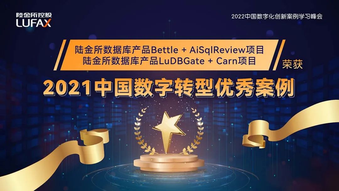 近日,在“2022中国数字化创新案例学习峰会暨2021中国数字化TOP100案例颁奖典礼”上,陆金所数据库产品Bettle + AiSqlReview案例、陆金所数据库产品LuDBGate + Carn两个案例入选“2021中国数字转型优秀案例”。