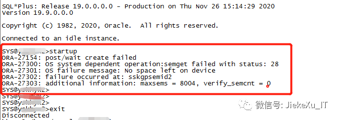 大家好,我是 JiekeXu,很高兴又和大家见面了,今天分享一篇 重启数据库遇到错误ORA-27154,ORA-27300,ORA-27301,ORA-27302该怎么办?本文首发于微信公众号【JiekeXu之路】,欢迎点击上方蓝字关注我,标星或置顶,更多干货第一时间到达!