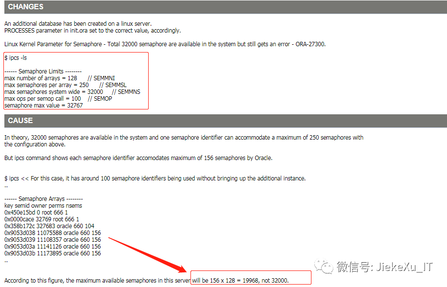 [root@JiekeXu ~]$ ipcs...----- Semaphore Arrays --------key semid owner perms nsems0x21b9674c 196610 oracle 660 1270x21b9674d 229379 oracle 660 1270x21b9674e 262148 oracle 660 127...If we assume this is the case here.假如我们遇到的是这种情况,So, here, the actual semaphore accommodated per array is not 250, it is 127.这说明每个数组中不是250,而是127,So, practically, only 16256 (128*127) can present in the server.所以只有16256个可用的信号量,这也就是我们计算processes总量远远未达到32000,但是依旧报错的原因,Solution解决方案:kernel.sem = 250 32000 100 128 ---- >>>> This indicates that 250 semaphores can be accomodated in an array and maximum of 128 arrays can be in the system.So, in total, 32000 (250X128) semaphores can present in the system.Thus We need to increase the maximum number of arrays that can be present on the server.Kindly follow the below steps :-----------------------------------1. Query the current semaphore values in the kernel# sbin/sysctl -a | grep sem2. Modify SEMMNI value in the etc/sysctl.conf.Fromkernel.sem = 250 32000 100 128Tokernel.sem = 250 32000 100 2003. # sbin/sysctl -p这里建议的是将kernel.sem修改为250X200,,但是中间的32000未改变,但是根据在support.redhat.com 上的文档How to increase the number of semaphores:将sysctl.conf中设置为kernel.sem = 250 64000 100 256并sysctl -p ,解决该问题。