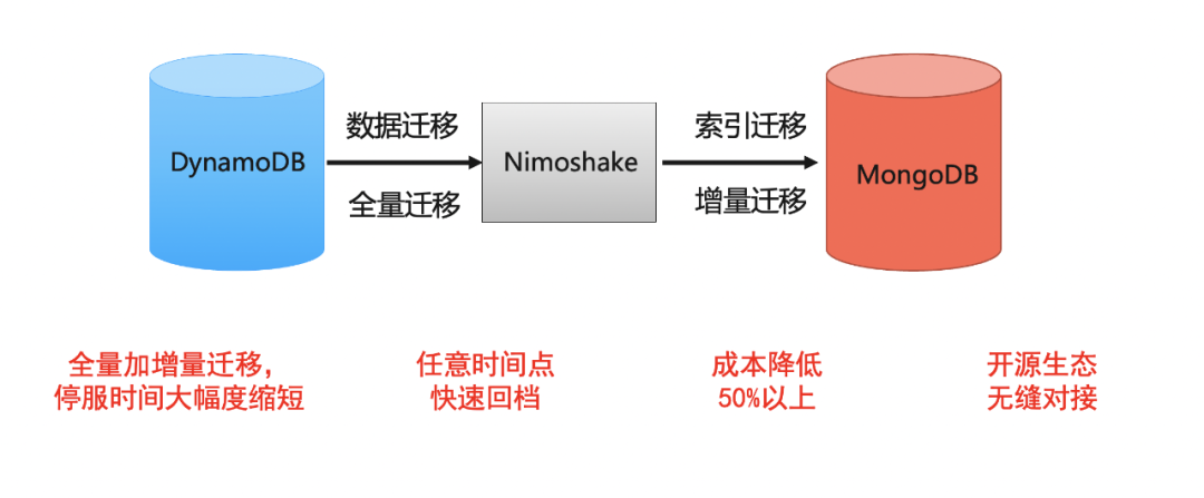 DynamoDB借鉴于MongoDB,两者具备同样的类Json语法和schema-free能力,阿里云MongoDB提供从DynamoDB向阿里云MongoDB的数据搬迁通道,使客户能用较低的改造量便完成从DynamoDB的到MongoDB的迁移。