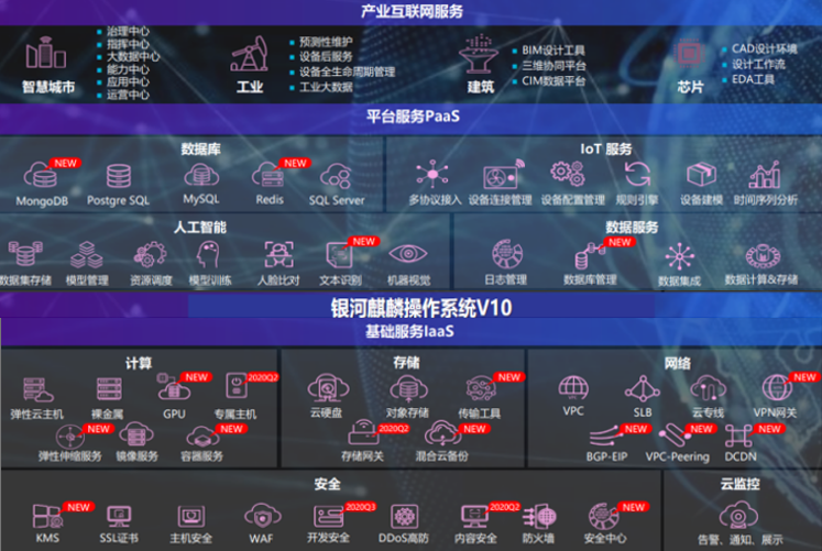 银河麒麟操作系统以HostOS作为云平台的底座操作系统、以GuestOS作为业务应用系统的底座引擎,可全面支持虚拟化、容器、微服务、分布式文件系统等云原生技术,支撑构建大型数据中心服务器高可用集群、负载均衡集群、分布式集群文件系统、虚拟化应用和容器云平台等,可部署在物理服务器和虚拟化环境、私有云、公有云和混合云环境。