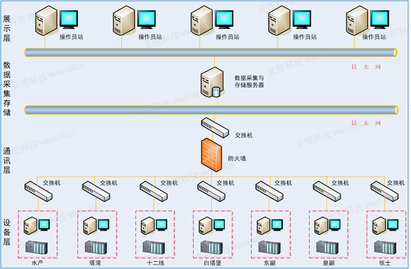 系统分为四层,分别是设备层、通讯层、数据采集存储层和展示层。